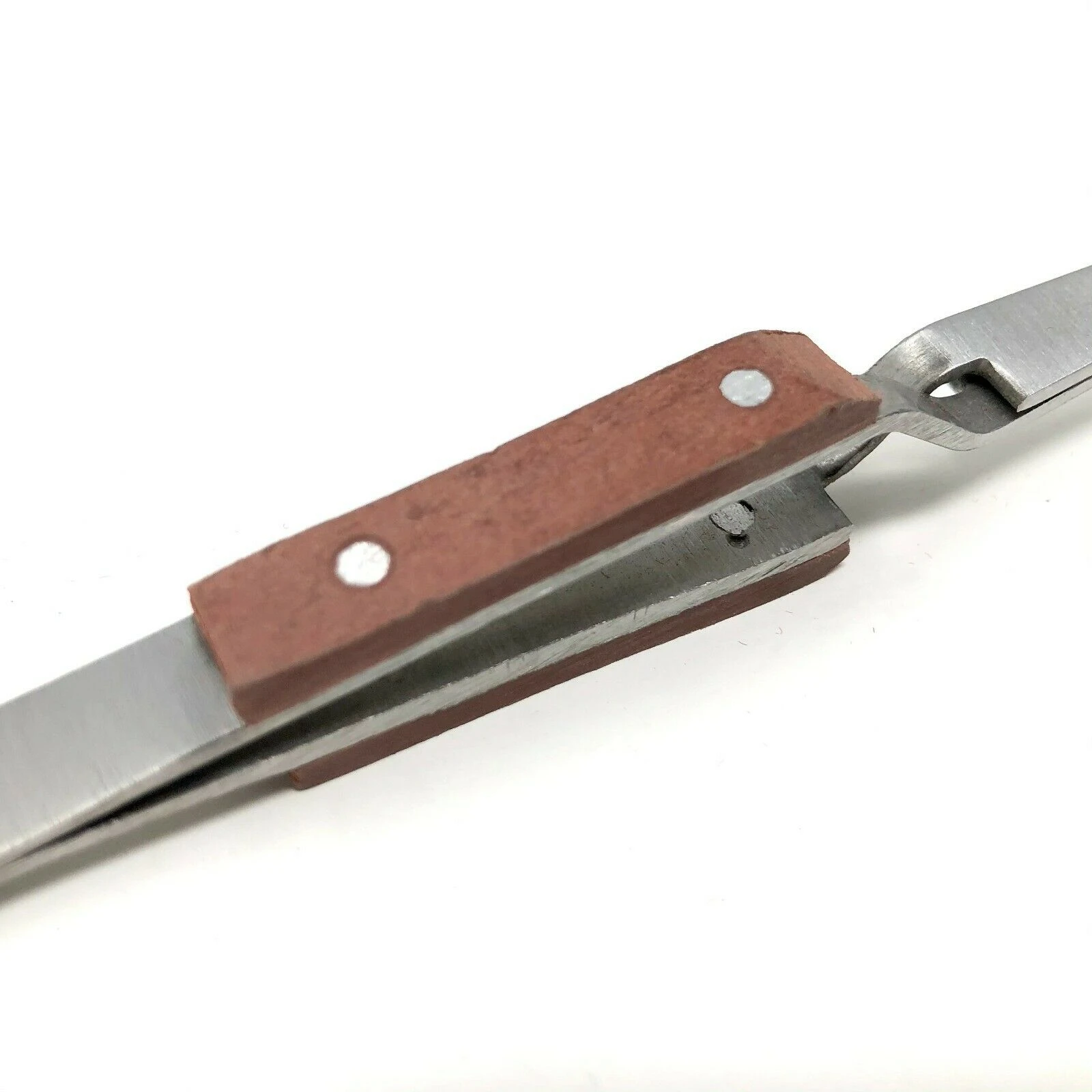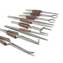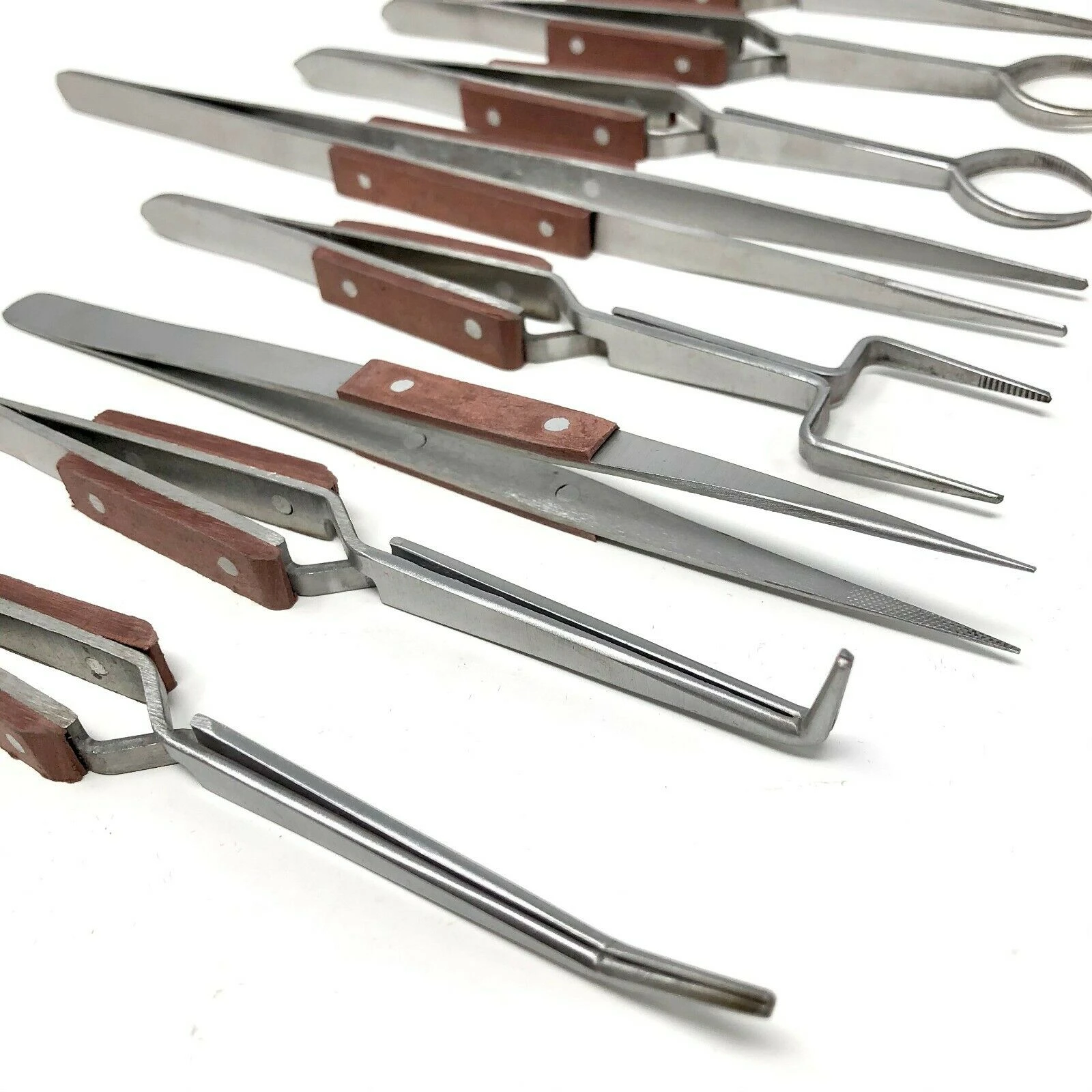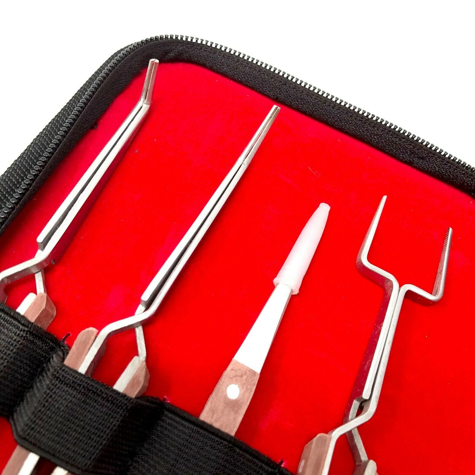 - A set of 8 soldering tweezers in a faux-leather wallet with soft red velvet interior and elasticated slots