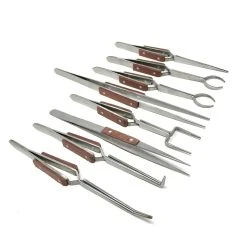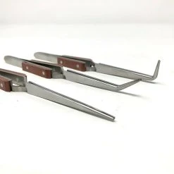 - Three 6.5″ straight tweezers with small round mouth, large round mouth and square mouth profile