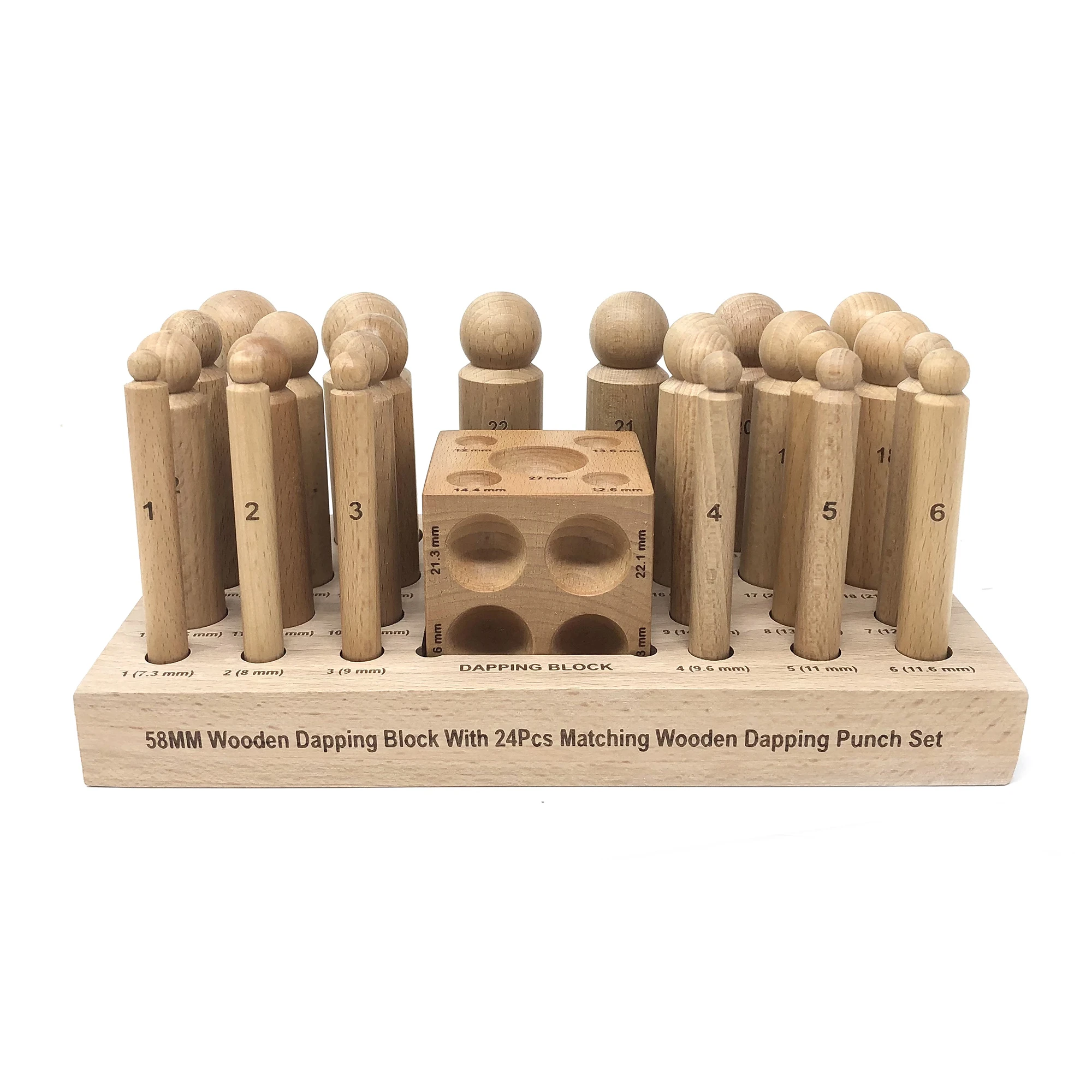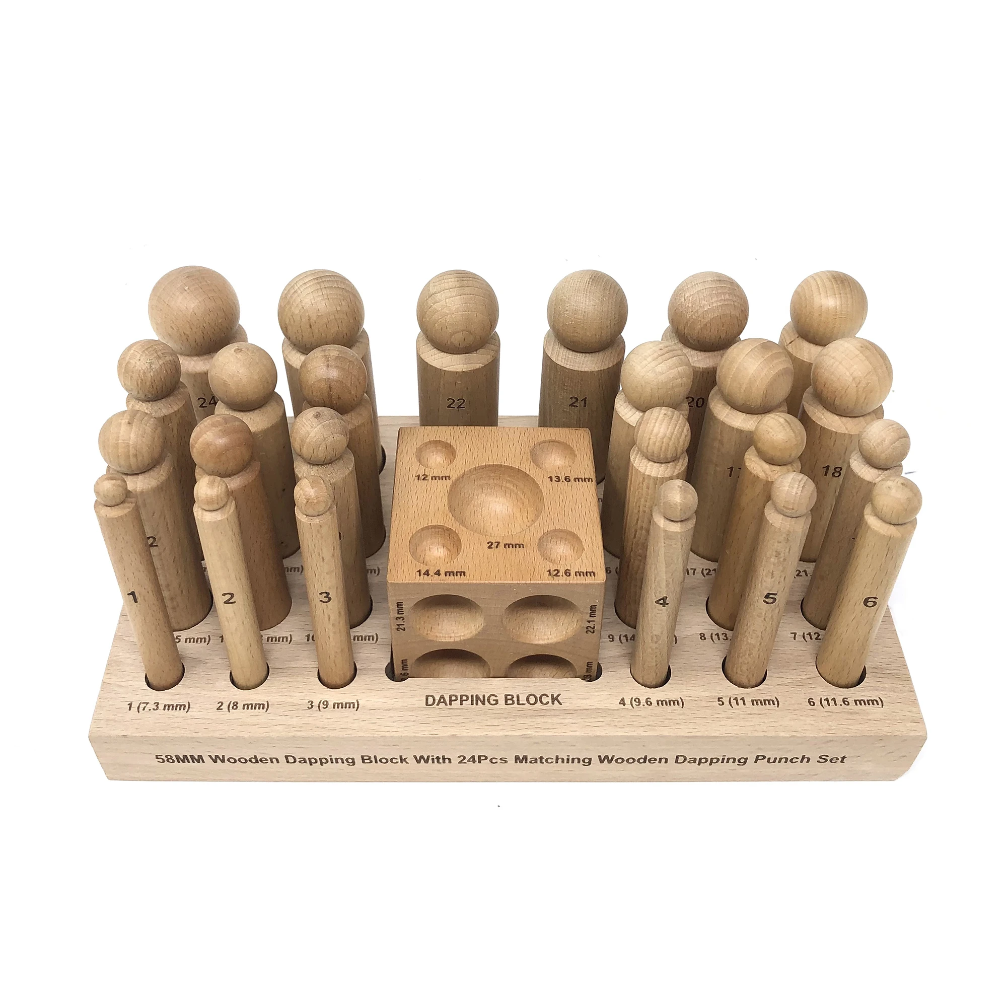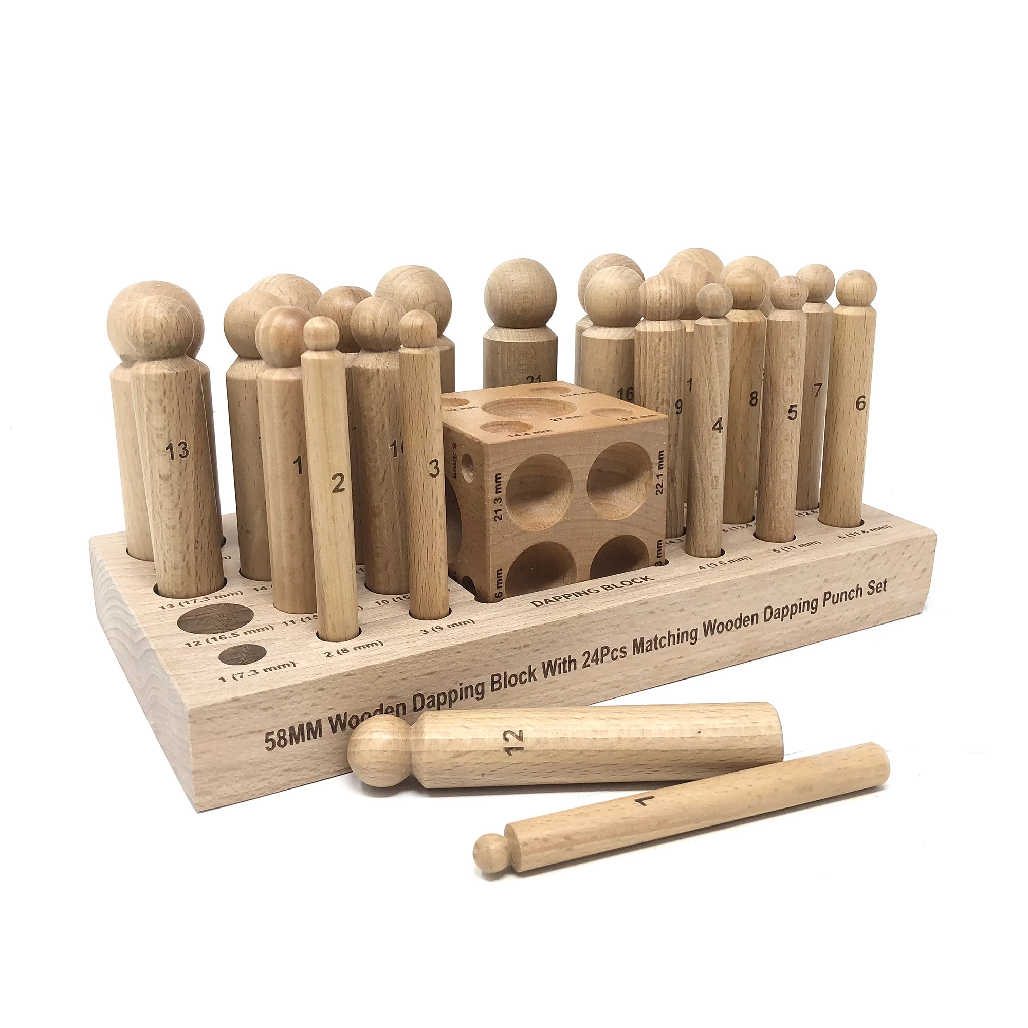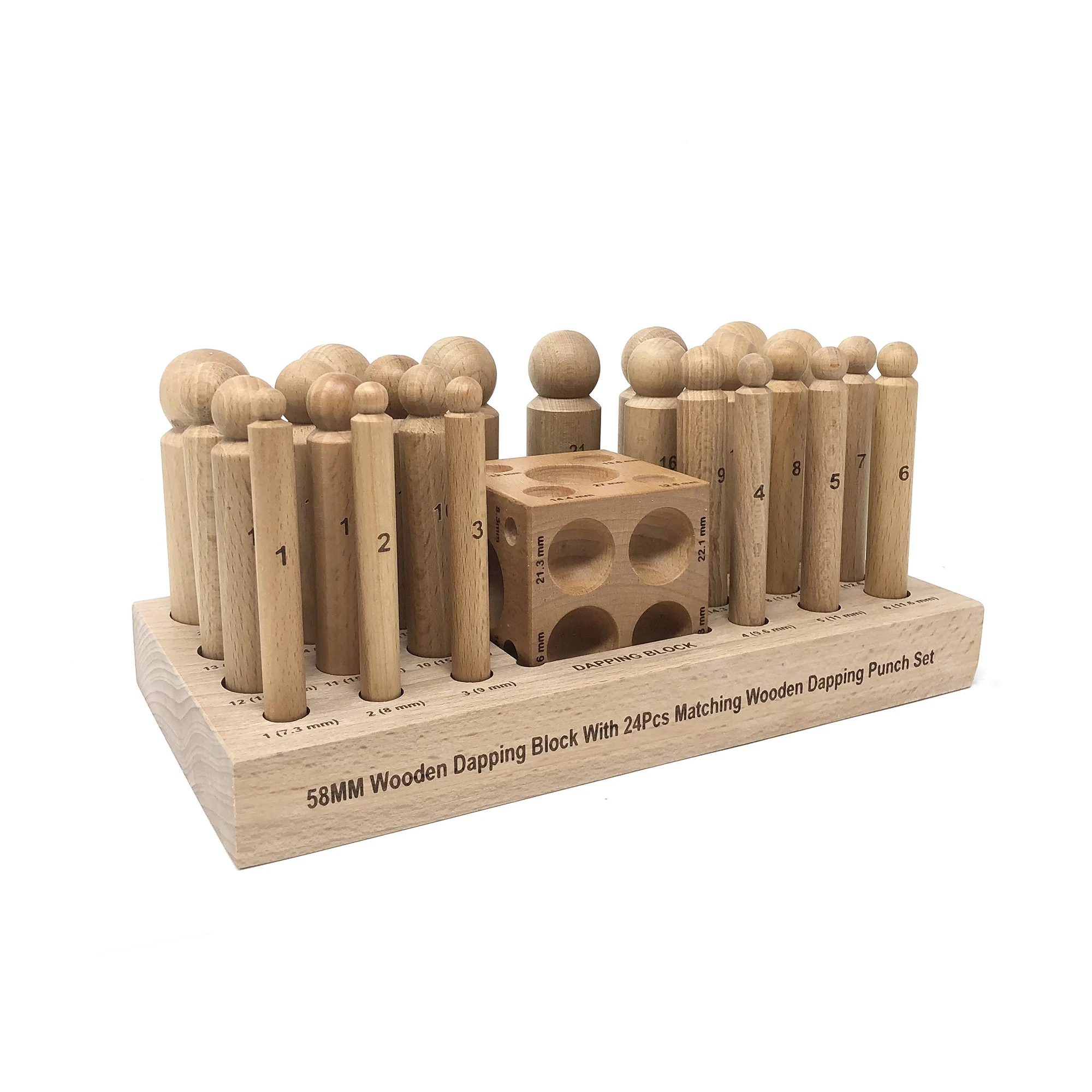- A set of 24 wooden dapping punches a and doming cube