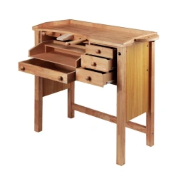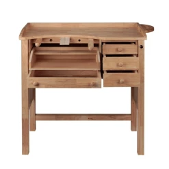 It is beautifully crafted from an eco-friendly hardwood, creating a super strong work surface to give a lifetime of use. The high railings around the top edges and sides prevent anything from slipping off. Key features also include three side drawers, providing valuable storage space to keep all your tools and accessories, a large central draw which has a base lined with galvanised steel, plus a slide-out centre tray with a cut-out area which also includes a rear shelf.