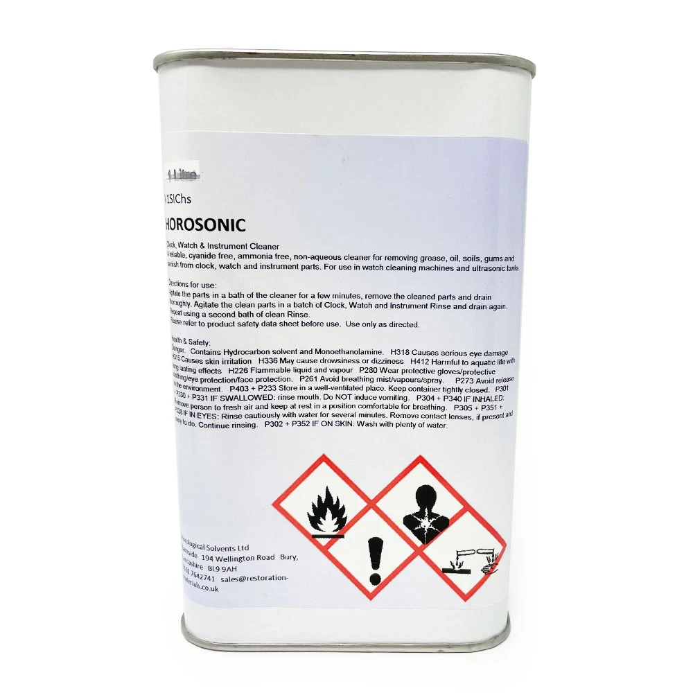 For clocks, meters and instruments. A reliable cyanide free cleaner for removing grease, oils, soils, gums and tarnish from clock and instrument parts. Clean first, then rinse twice with Horosonic Rinse. Contains 1 litre.