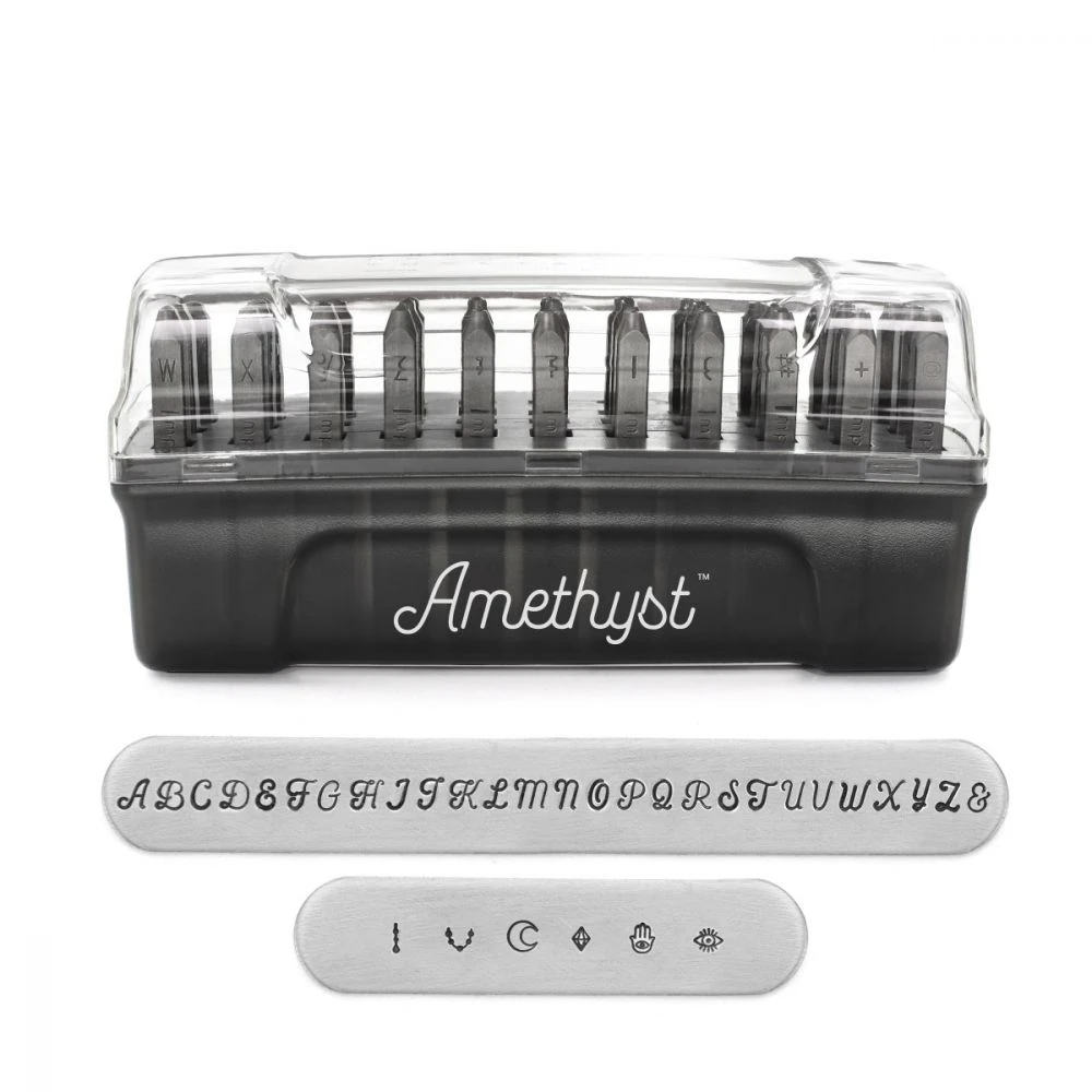 Named after the semi-precious stone and its metaphysical properties, ImpressArt’s 3mm Signature Amethyst letter set brings a more organic, geometric hand-lettered feel to a traditional script. This letter stamp set is the perfect hand stamping script— modern, clean, and readable with some mystical italic flair. Channel a deeper level of your spirituality as you connect the letters of 3mm Signature Amethyst and incorporate its magical metacosmic-themed design stamps into your hand-stamped creations.