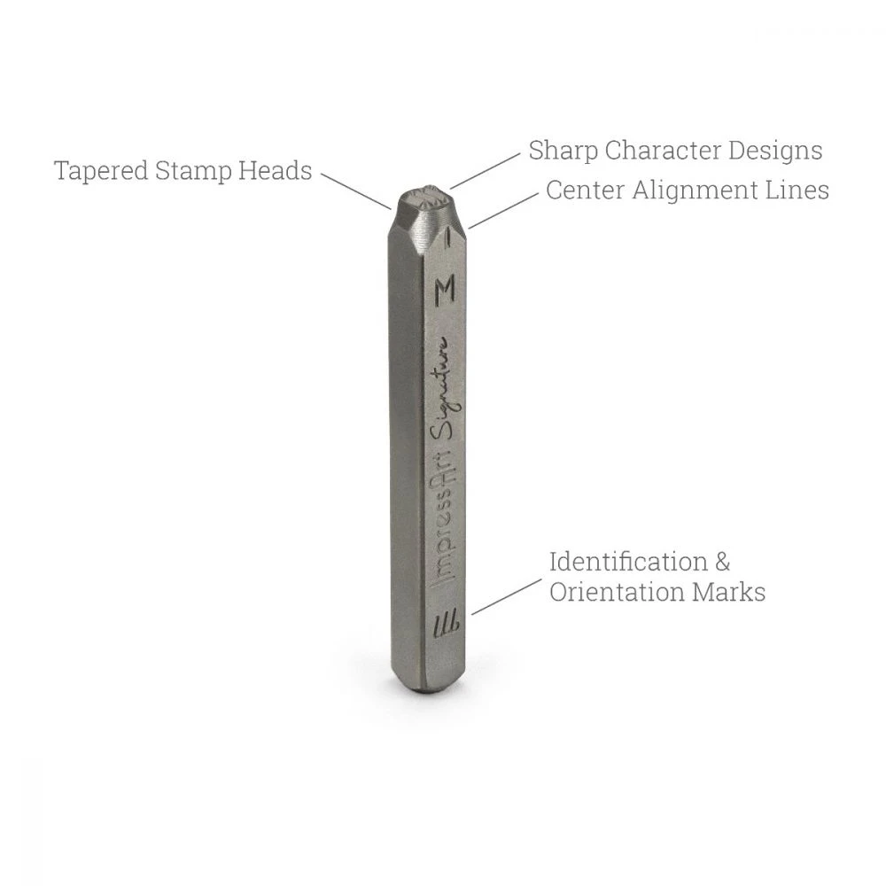 ImpressArt Signature metal stamps are professional quality stamps, manufactured to the highest standard for durability and alignment. Stamps are engineered from hardened steel and rated to endure stamping on soft and hard metals up to Stainless Steel*. Sharp character edges ensure crisp, deep impressions project after project. Characters are marked on side of stamp for easy identification and orientation.